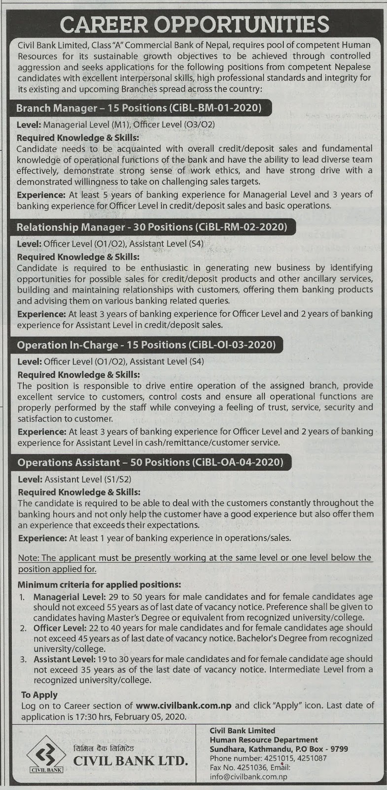 काठमाडौं – सिभिल बैंकमा जागिर खुल्ला भएको छ । बैंकमा ४ पदका लागि कर्मचार माग गरेको हो । बैंकले ब्रान्च म्यानेजरका लागि केही, रिलेसनसिप म्यानेजर पदका लागि केहि, ओप्रेसन-इन-चार्ज पदका लागि केहि र ओप्रेसन असिस्टेन्ट पदका लागि केही संख्यामा कर्मचारीको माग गरेको जनाएको छ ।