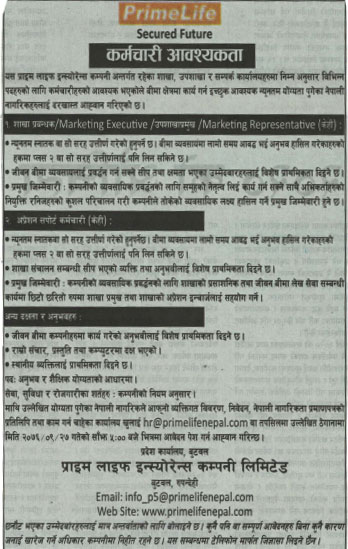 प्राइम लाइफ इन्स्योरेन्सले माग्यो २ पदका लागि कर्मचारी, +२ पासलाई पनि अवसर