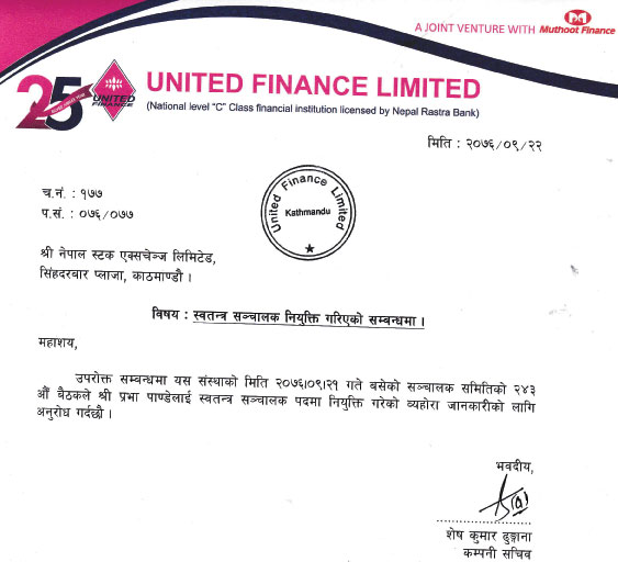 युनाइटेड फाइनान्सको स्वतन्त्र सञ्चालकमा प्रभा पाण्डे नियुक्त अर्थ सरोकार २२ पुष २०७६, मंगलवार पढ्न लाग्ने समय: १ मिनेटभन्दा कम ENG काठमाडौँ – युनाइटेड फाइनान्सको स्वतन्त्र सञ्चालक पदमा प्रभा पाण्डे नियुक्त भएकी छिन् । कम्पनीको पुस २१ गते बसेको सञ्चालक समितिको २४३ औं बैठकले पाण्डेलाई उक्त पदमा नियुक्त गर्ने निर्णय गरेको हो । छुटाउनु भयो कि ? ‘यौन दुर्व्यवहार’को जाहेरी परेर थुनिएका कार्कीलाई एनआईसी एशियाले अझै हटाएन