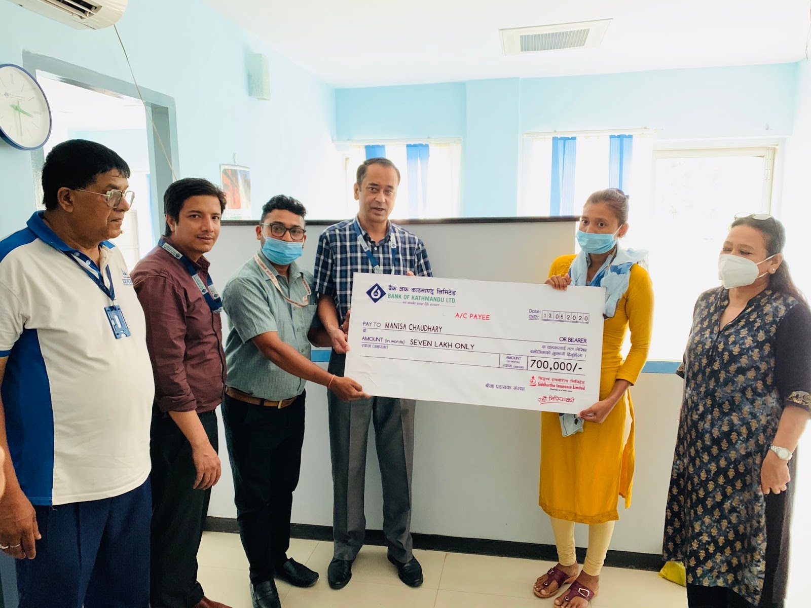 उक्त शाखाका खातावाहक अमिर चौधरीको दुर्घटनामा परी असामयिक निधन भएकोले बैंकले बीमा सेवा प्रदायक कम्पनी सिद्धार्थ इन्स्योरेन्स कम्पनी लिमिटेडसंग समन्वयमा बैंक प्रदेश नं. १ का प्रादेशिक कार्यालय प्रमुख दिपेन्द्र बुढाथोकीबाट उक्त बीमा दाबी रकम स्व. चौधरीका श्रीमती मनिषा चौधरीलाई हस्तान्तरण गरे ।