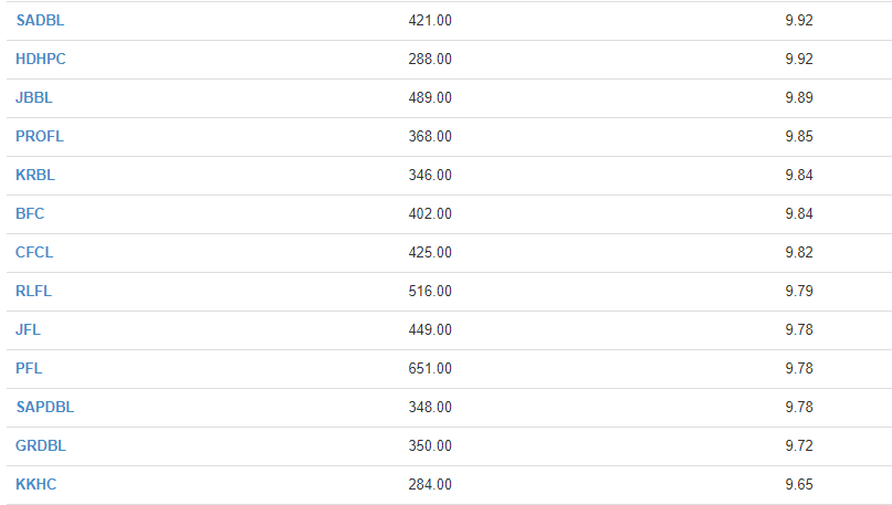 यस्तै ९ प्रतिशत भन्दा बढीले सेयर मूल्य बढ्ने कम्पनीहरुमा शाइन रेसुङ्गा डेभलपमेन्ट बैंक, मल्टिपर्पोज फाइनान्स, समृद्धि फाइनान्स, महालक्ष्मी विकास बैंक, गुडविल फाइनान्स, सांग्रिला डेभलपमेन्ट बैंक, हिमाल दोलखा हाईड्रोपावर कम्पनी, ज्योति विकास बैंक र प्रोग्रेसिभ फाइनान्स लगायत रहका छन् ।