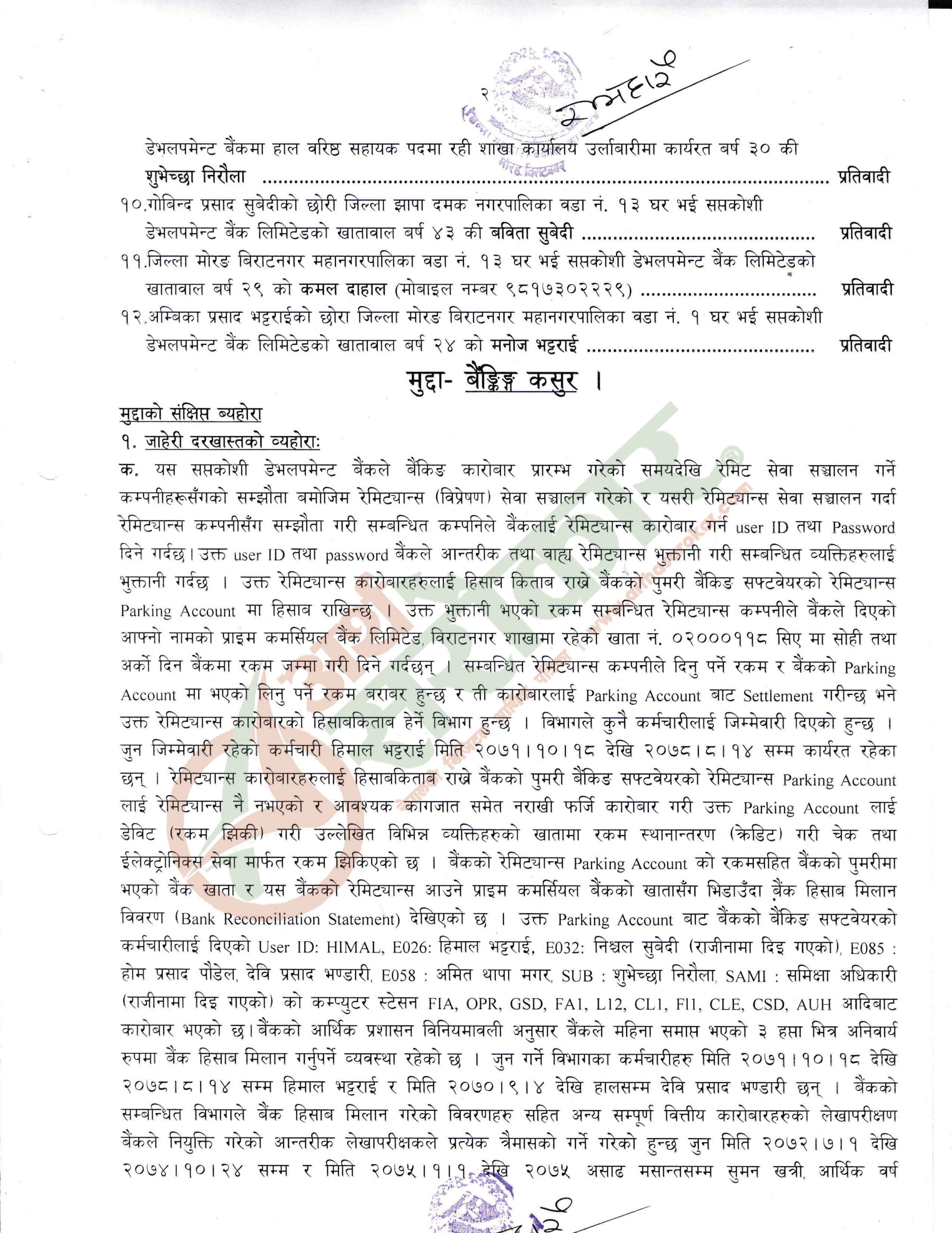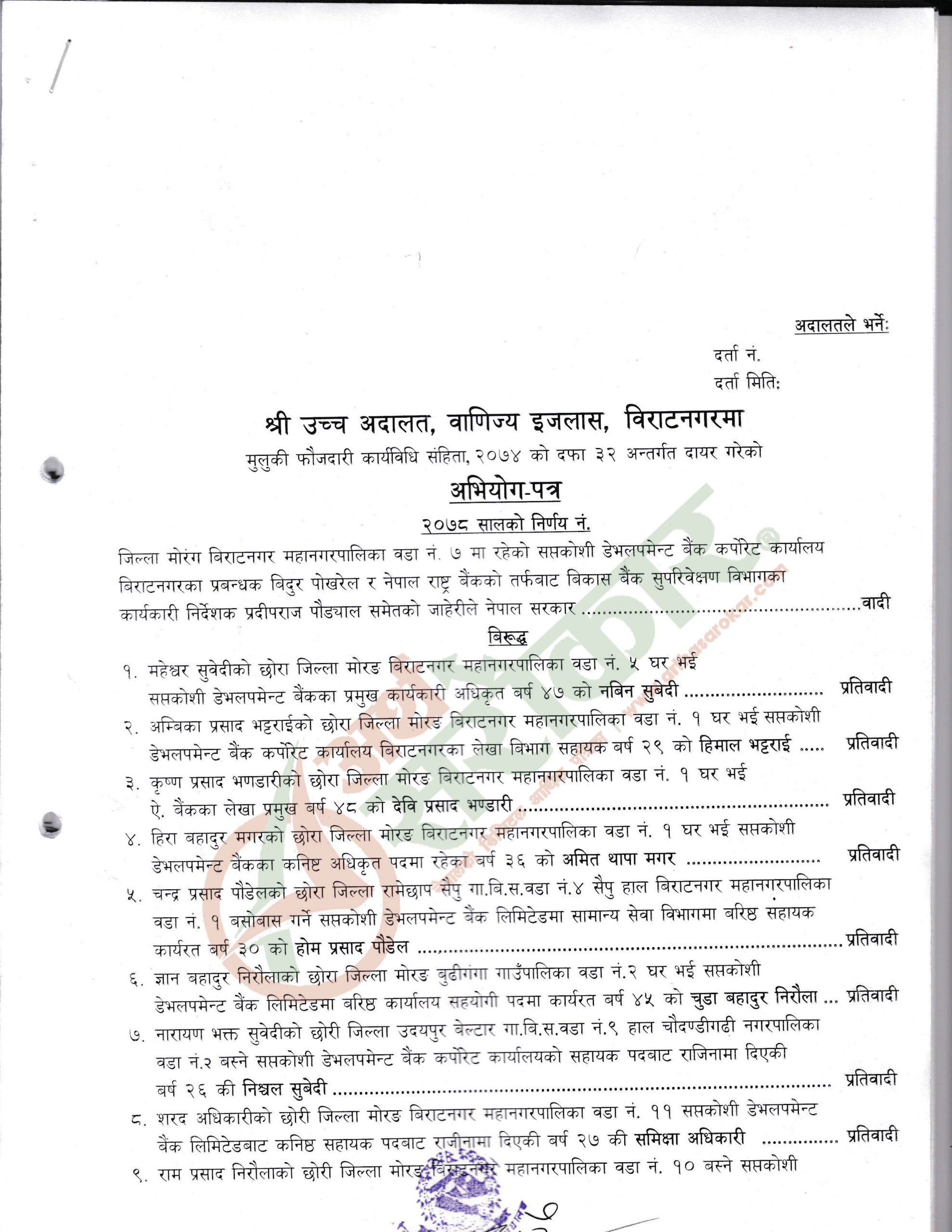 केहि समय अगाडी सार्वजनिक भएको सप्तकोशी डेभलपमेन्ट बैंक घोटाला प्रकरणमा अदालतमा पेश भएको ३८ पाना लामो अभियोगपत्र अर्थ सरोकारले फेला पारेको छ । सो अभियोगपत्रमा घटनाबारे सविस्तार खुलाईएको छ भने घटनामा संलग्नहरुको बयान पनि उल्लेख छ । यो प्रकरण कसले घटायो ? कसरी घट्यो ? के के भयो ? कसकसले के के गर्ने ? अभियोगपत्रमा घटनामा संलग्नहरुको बयानसहितको पूरा विवरण उल्लेख गरिएको छ ।