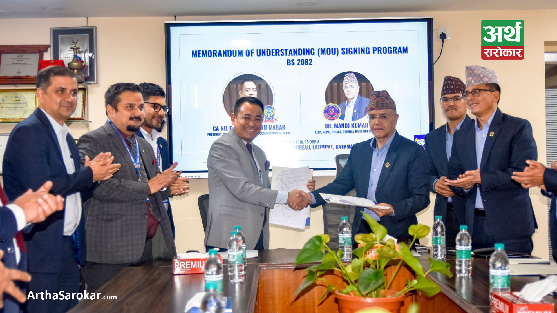 काठमाडौं। नेपाल चार्टर्ड एकाउन्टेन्ट्स संस्था (आइक्यान) र नेपाल प्रहरीको केन्द्रीय अनुसन्धान ब्युरो (सिआईबी) ले संस्थागत आर्थिक अपराधविरुद्ध सहकार्य गर्ने भएका छन् । सोको लागि दुवै संस्थाले मंगलबार संस्थागत आर्थिक अपराध विरुद्ध सहकार्यका लागि पारस्परिक समझदारी–पत्रमा हस्ताक्षर गरेका छन् ।
