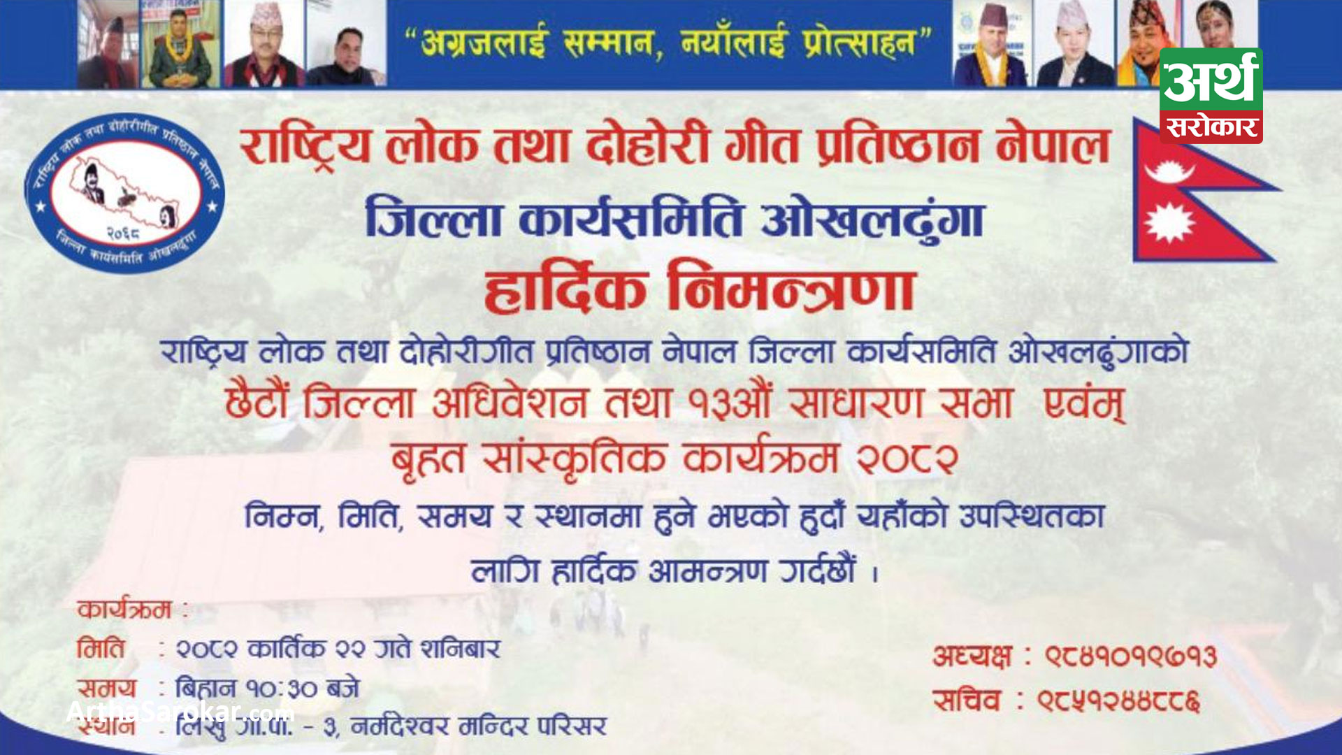 काठमाडौँ । राष्ट्रिय लोक तथा दोहोरी गीत प्रतिष्ठान नेपालको ओखलढुंगा कार्यसमितिको छैटौँ जिल्ला अधिवेशन हुने भएको छ ।