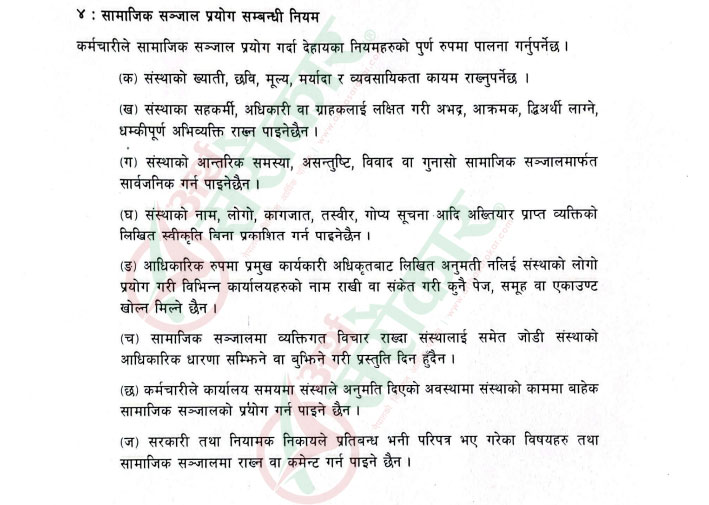 त्यस्तै, संस्थाको आन्तरिक समस्या, असन्तुष्टि, विवाद वा गुनासो सामाजिक सञ्जालमार्फत सार्वजनिक गर्न नपाइने पनि कार्यविधिमा उल्लेख गरिएको छ । त्यति मात्र होइन, संस्थाको नाम, लोगो, कागजात, तस्वीर, गोप्य सूचना आदी अख्तियार प्राप्त व्यक्तिको लिखित स्वीकृति बिना प्रकाशित गर्न नपाइने पनि कार्यविधिमा भनिएको छ ।