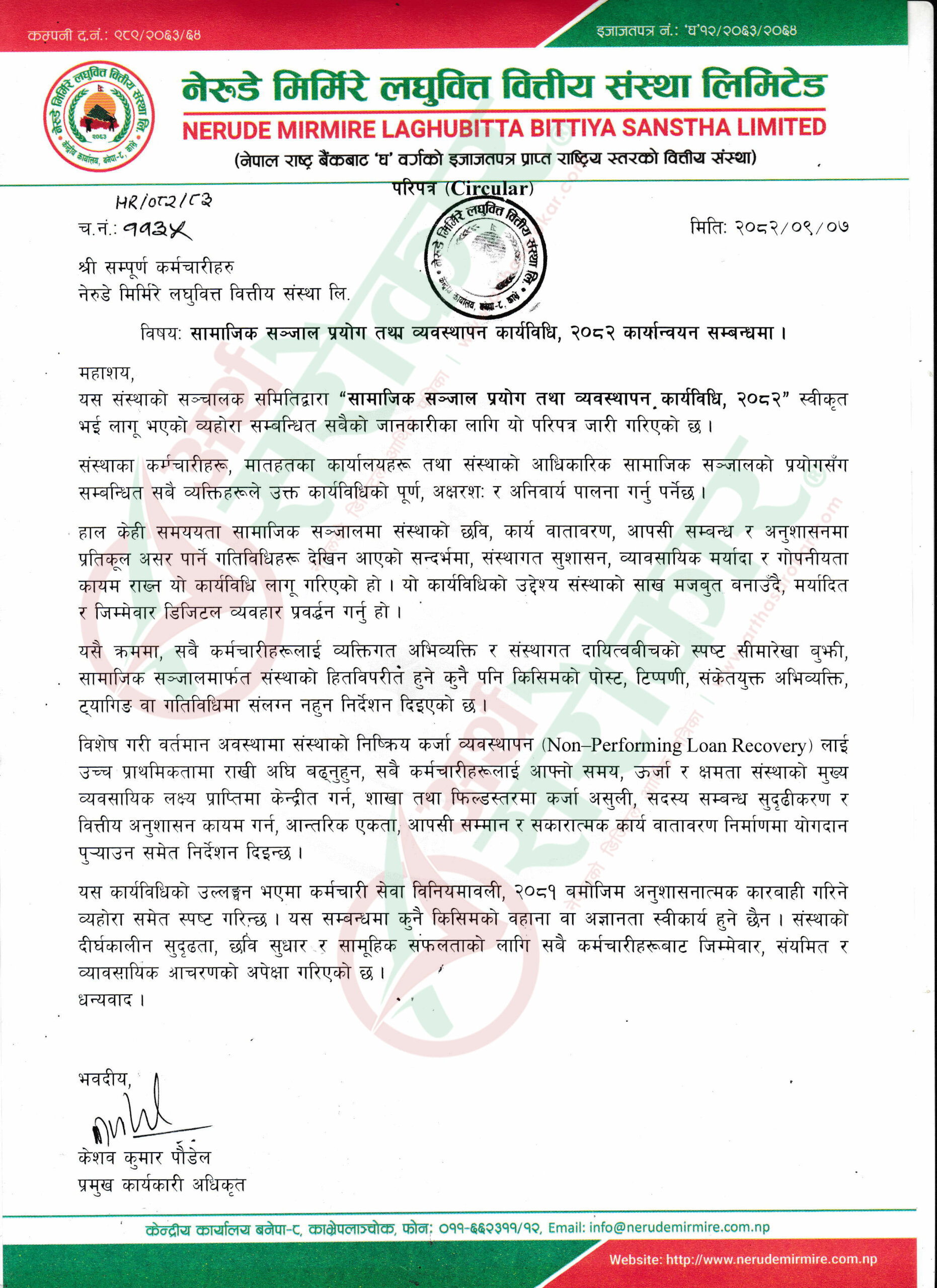 यतिसम्म की संस्थाले कार्यविधिमार्फत कर्मचारीहरुलाई कार्यालय समयमा सामाजिक सञ्जाल नचलाउन र सामाजिक सञ्जालमा व्यक्तिगत विचार राख्दा पनि संस्थालाई नजोड्न निर्देशन दिएको छ । यस्तो छ परिपत्र: