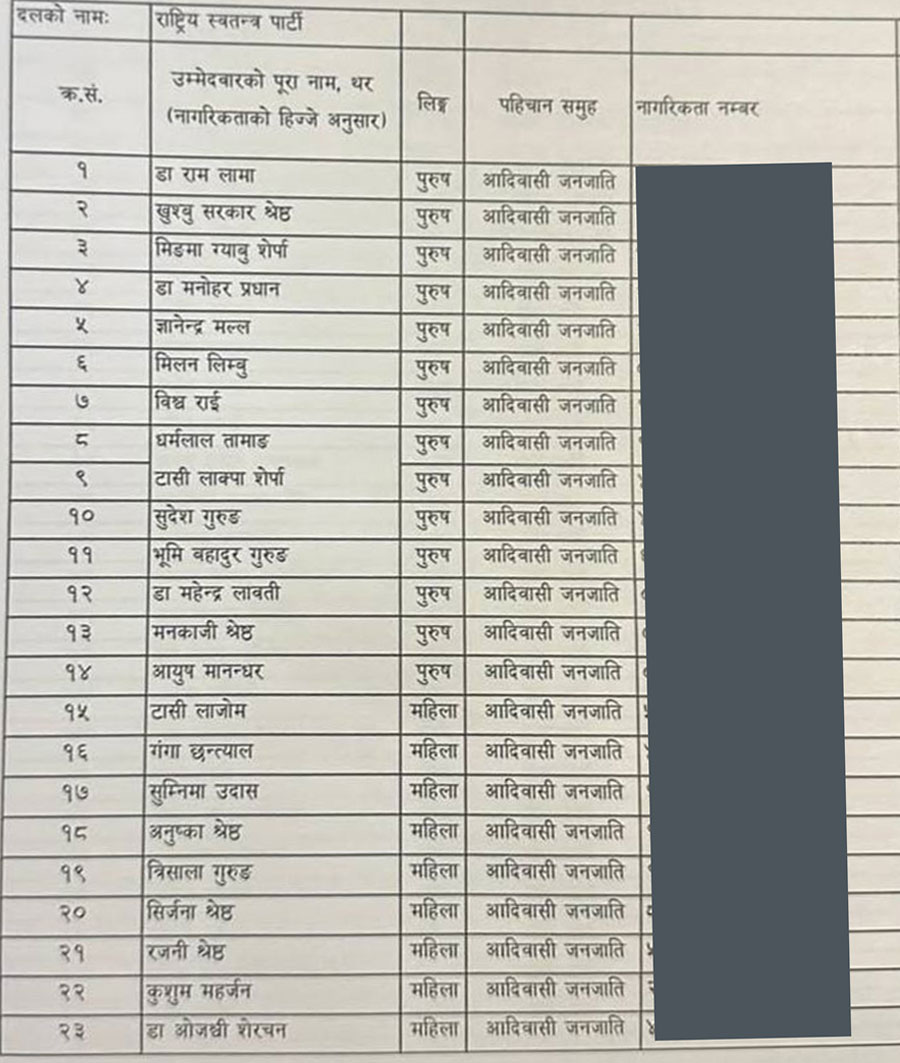 काठमाडौँ । राष्ट्रिय स्वतन्त्र पार्टी (रास्वपा) ले निर्वाचन आयोगमा समानुपातिक उम्मेदवारको बन्दसूची बुझाएको छ । रास्वपाले बुझाएको समानुपातिक उम्मेदवारको सूचीमा सेयर बजारका विज्ञदेखि उद्योगीसम्म छन् ।