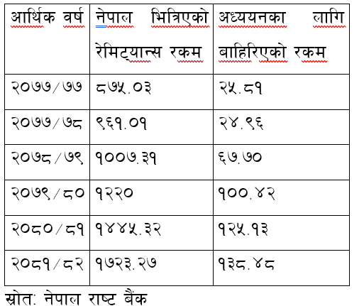 विदेश पढ्न जाँदा बाहिरिएको र नेपाल भित्रिएको रेमिट्यान्स रकम (रु.अर्बमा)
