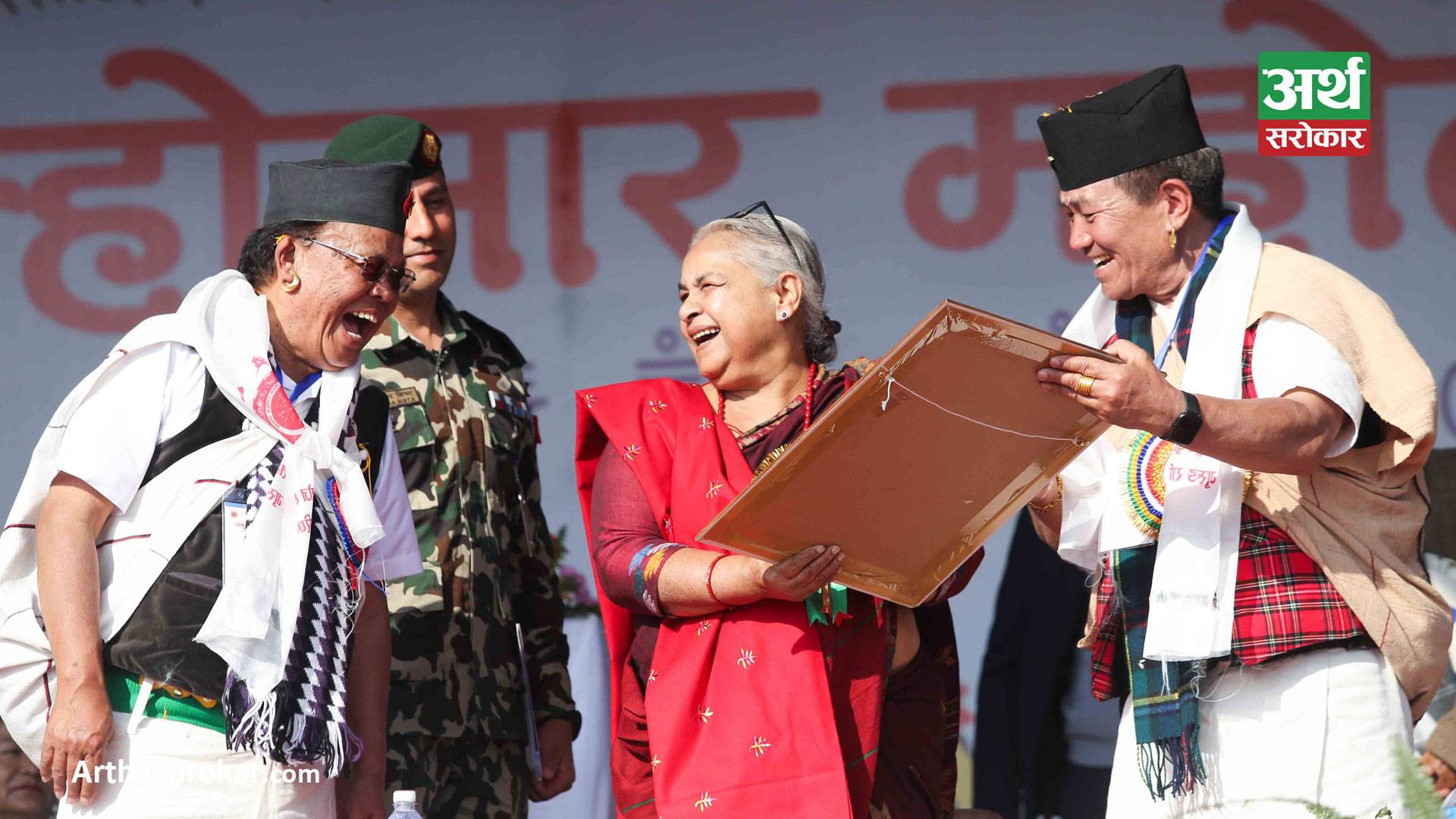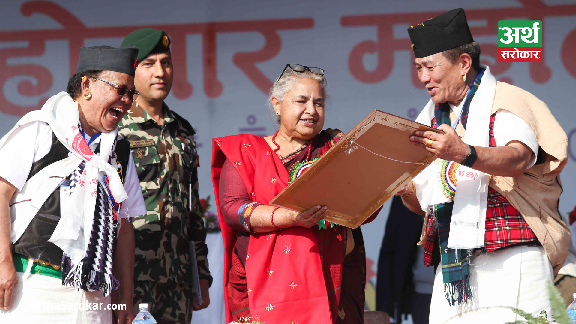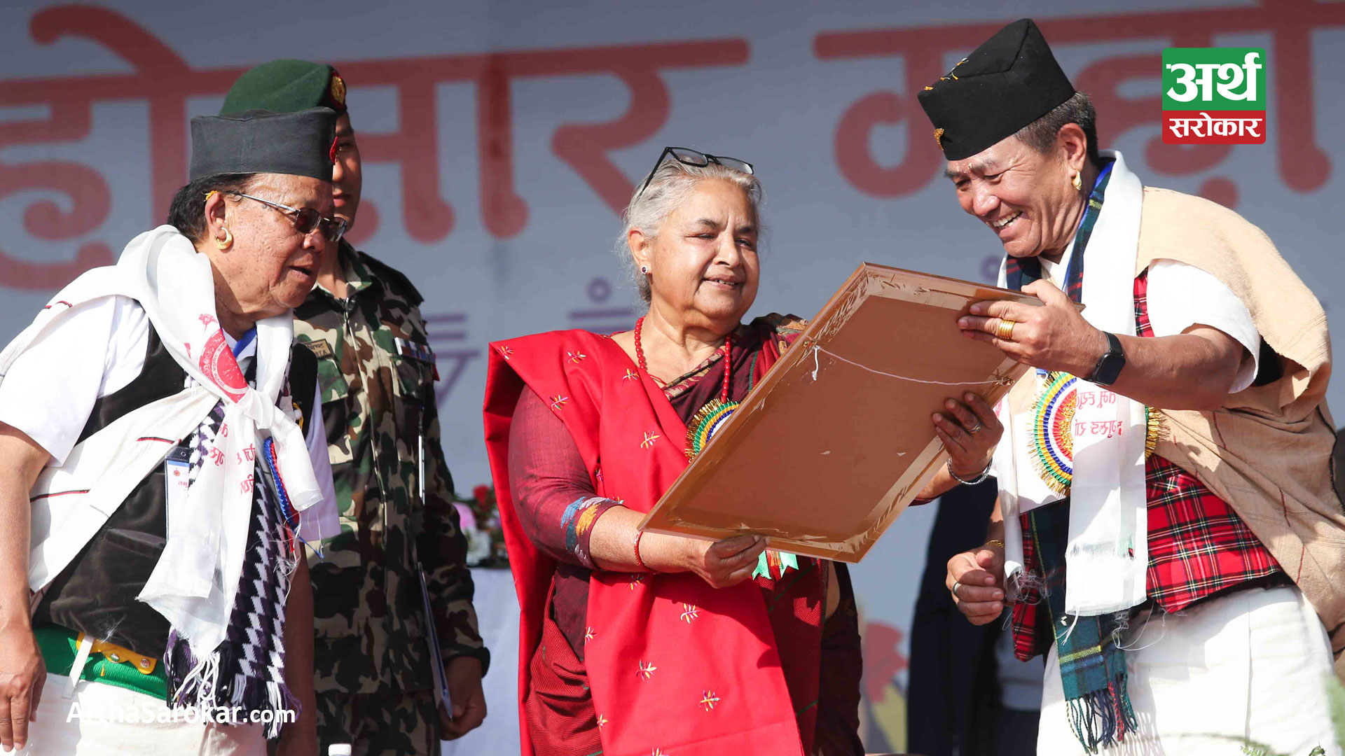 तेह्रथुमे ढाकाको साडीमा सजिएर टुँडिखेल पुगेकी प्रम कार्कीलाई आयोजकले उनकै स्केच फ्रेम गरेर उपहार दिएका थिए । गुरुङ पहिरन लगाएर नेपालको झण्डा बोकेको आफ्नो स्केच देखेर उनी मज्जाले हाँसेकी थिइन् । बाँकी तस्विरमा हेर्नुहोस्ः
