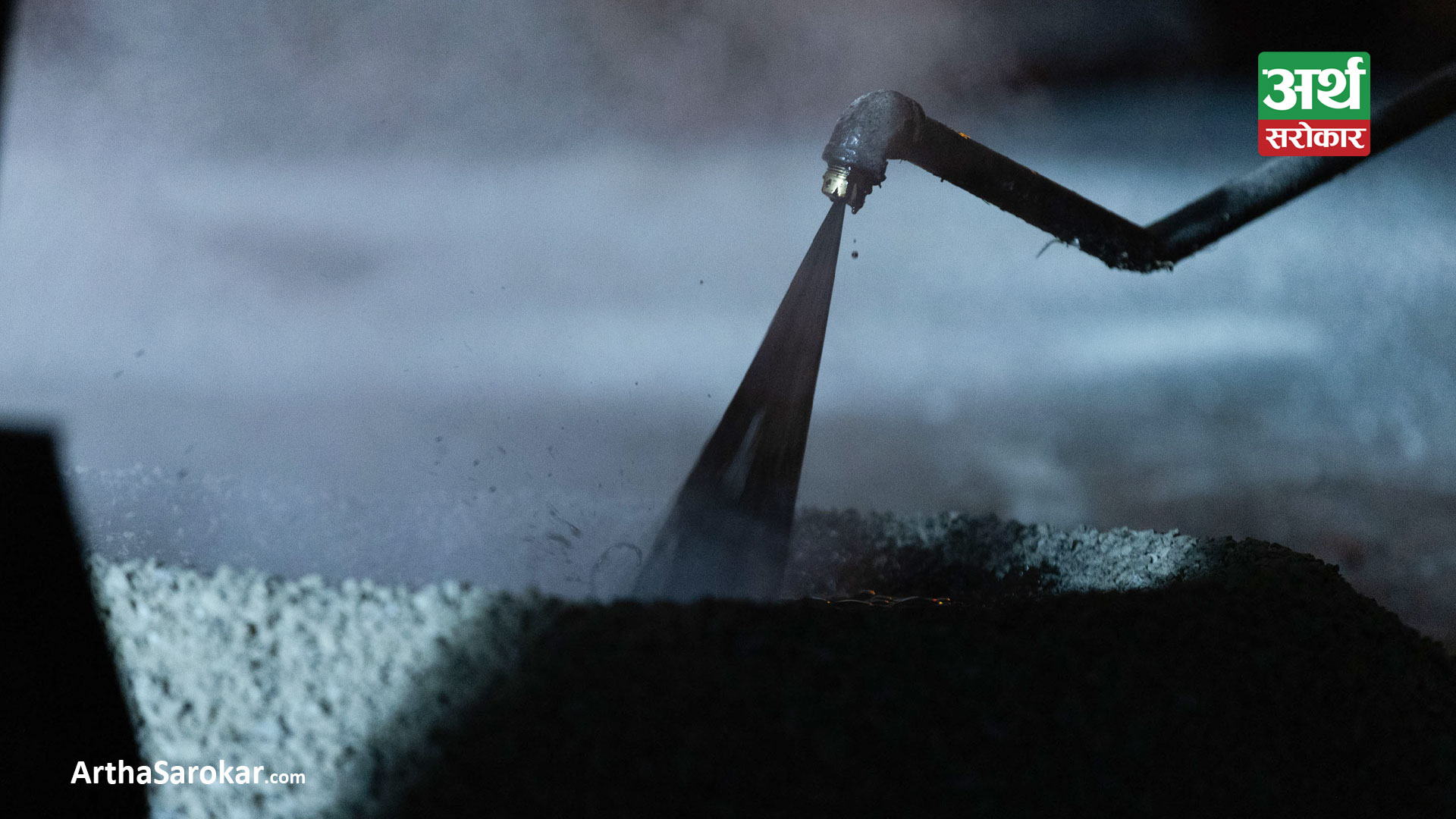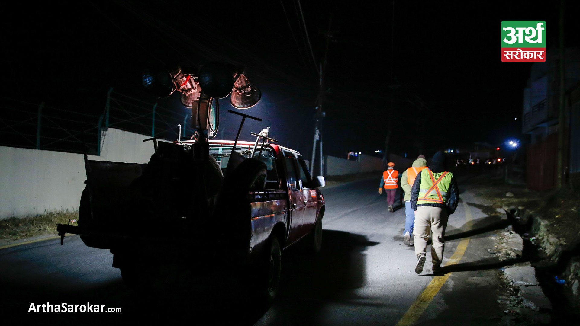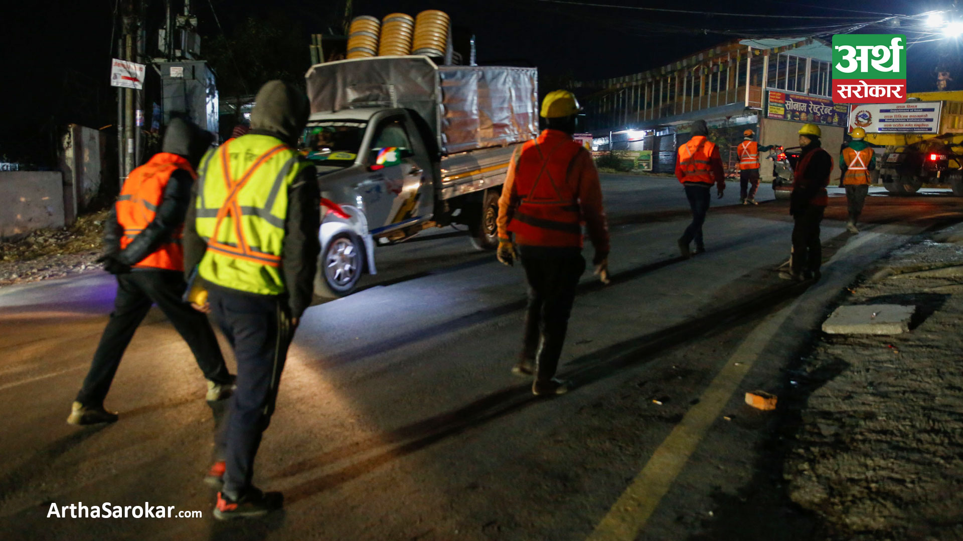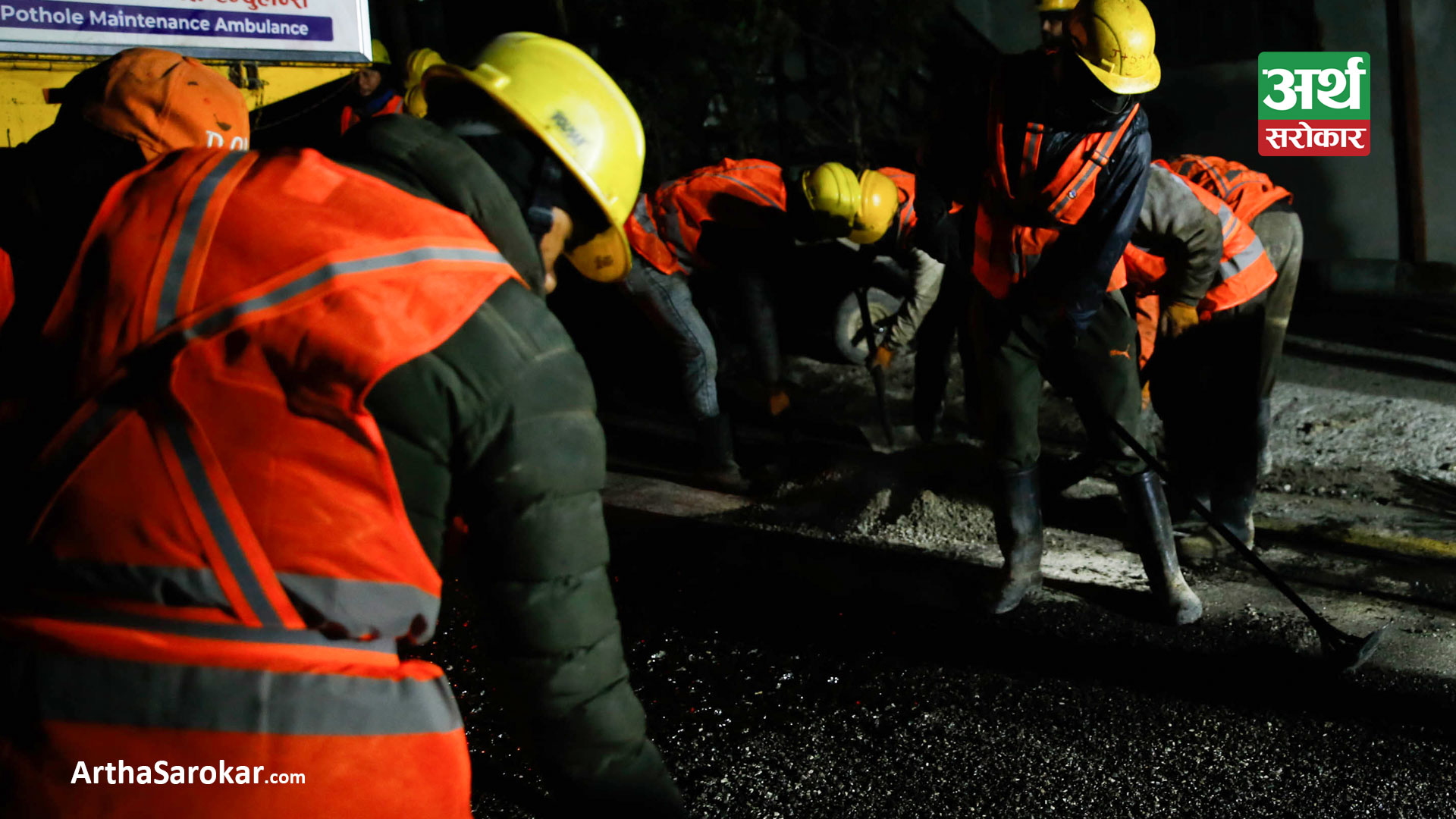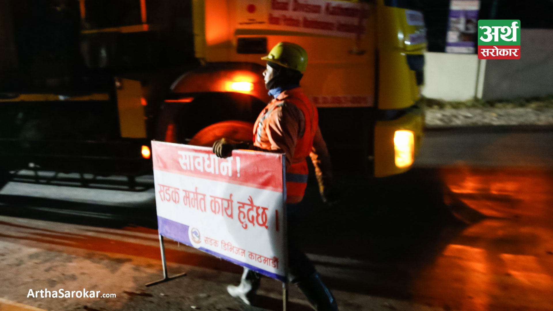 पोटहोल मर्मतका लागि मुलपानी क्षेत्रमा खटिएका इन्जिनियर फुयाँलले अत्यधिक सवारी चापका कारण अधिकांश मर्मतकार्य रातिको समयमा गरिने बताएका छन्। बाँकी तस्विरमा हेर्नुहोस्:
