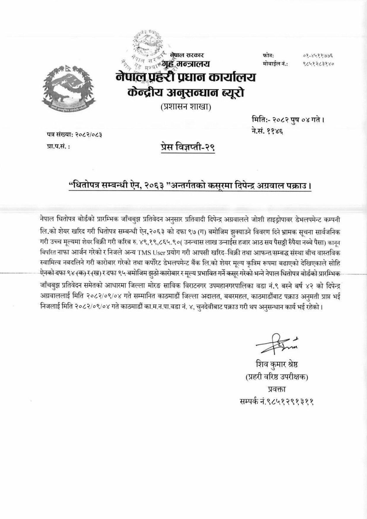 नेपाल धितोपत्र बोर्डले गरेको प्रारम्भिक जाँचबुझ अनुसार अग्रवालले जोशी हाइड्रोपावर डेभलपमेन्ट कम्पनीको सेयर कारोबारमा भ्रामक सूचना सार्वजनिक गरी उच्च मूल्यमा शेयर बिक्री गर्दै करिब ४९ लाख १९ हजार रुपैयाँ अवैध नाफा आर्जन गरेको देखिएको बोर्डको दाबी छ ।