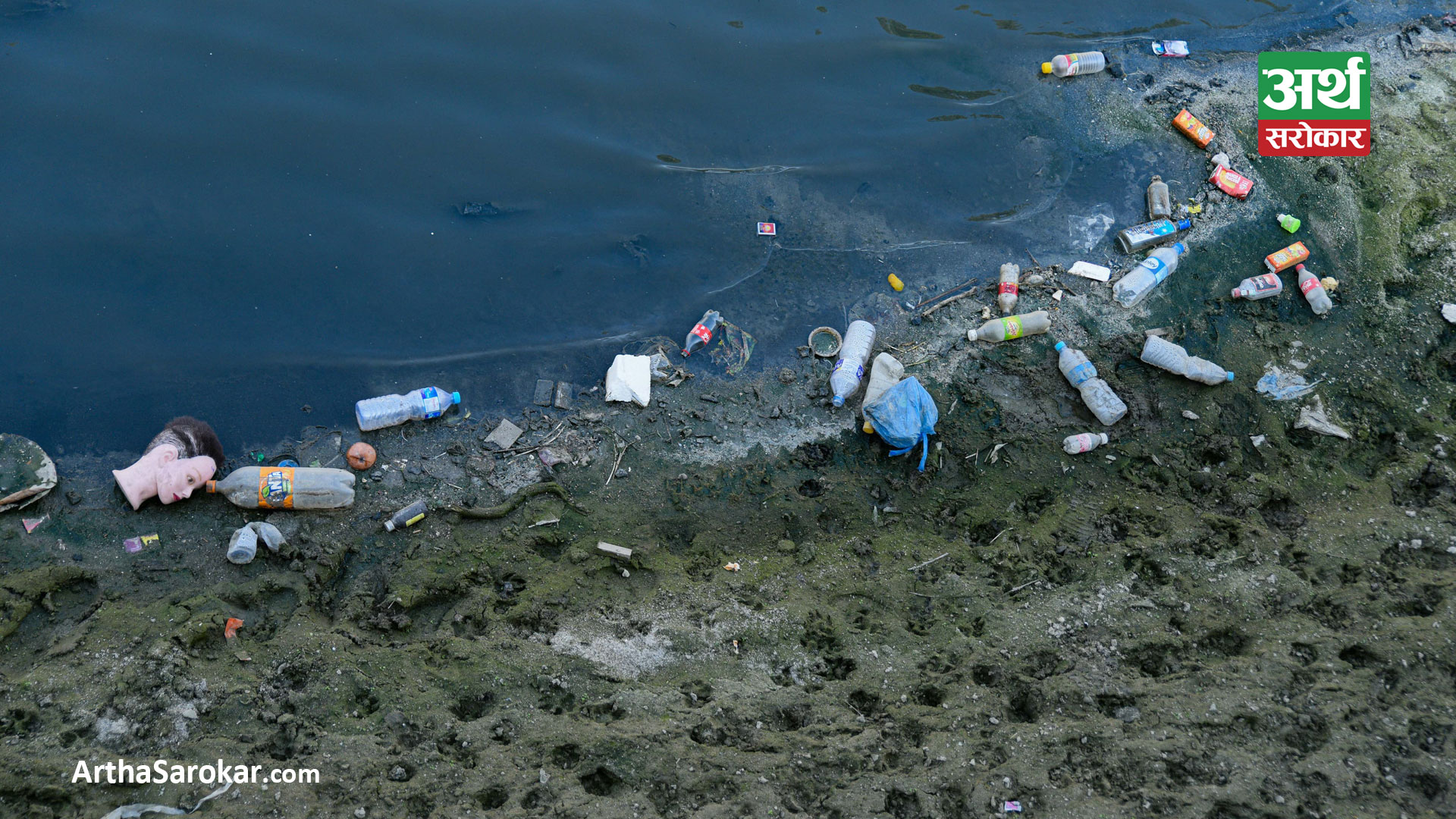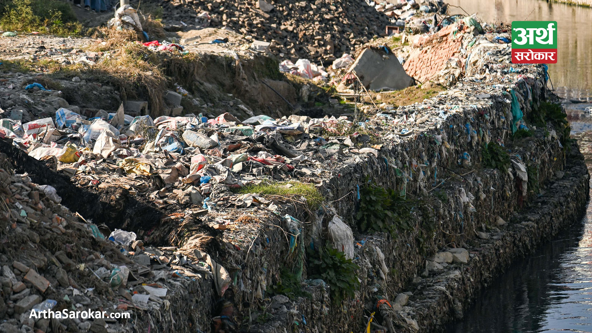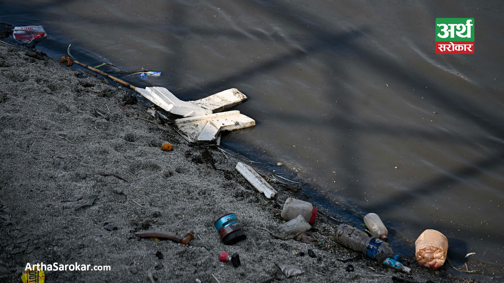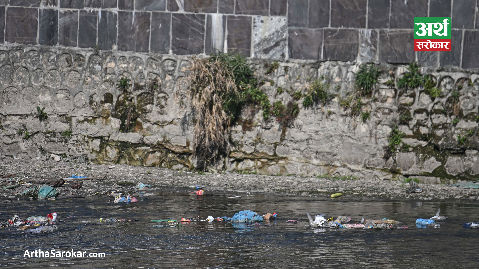 प्लास्टिक, घरेलु फोहोर, निर्माण सामग्री लगायतका थुप्राले नदीका सतह र किनार दुबै छोपिएका छन् ।