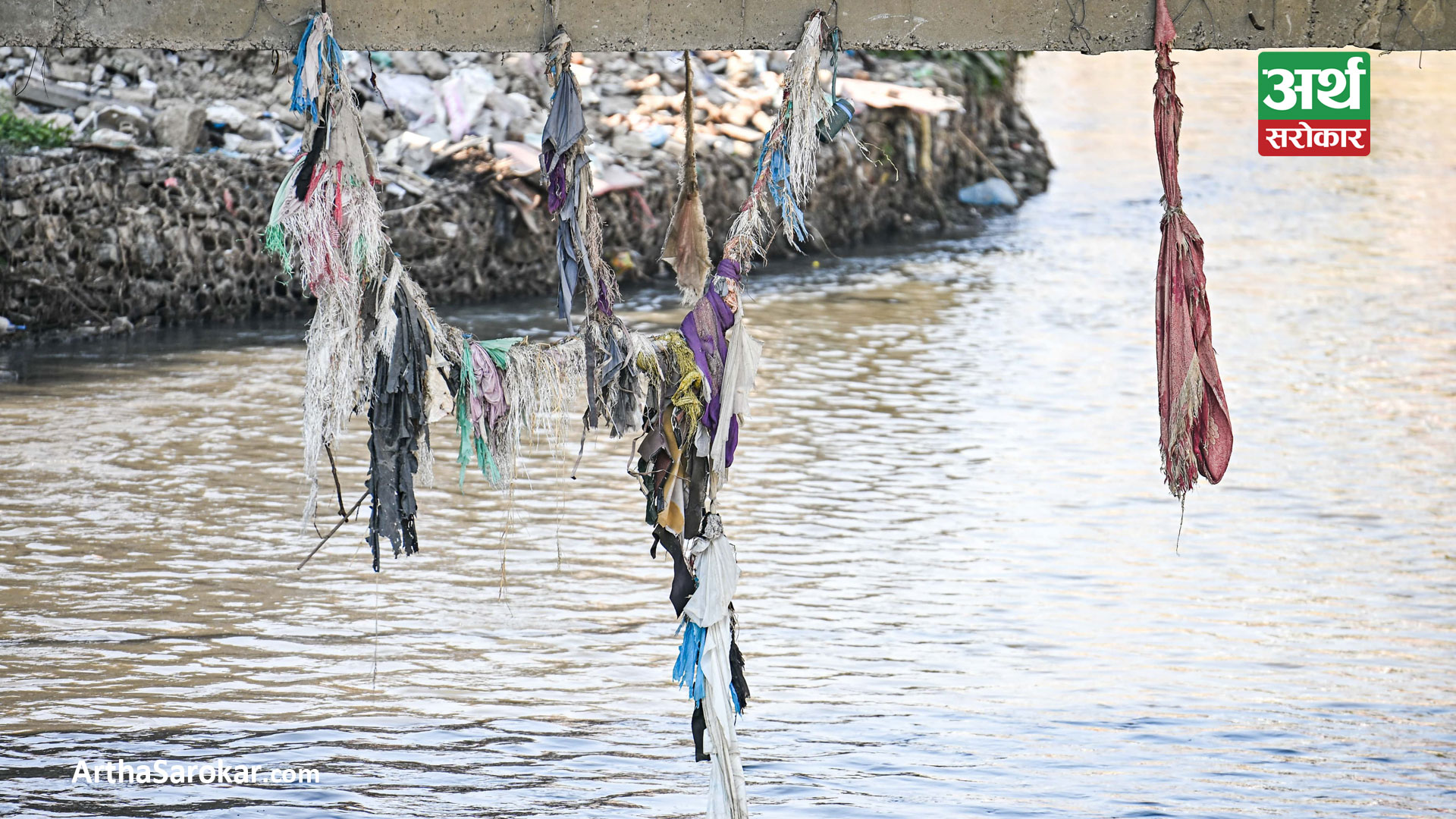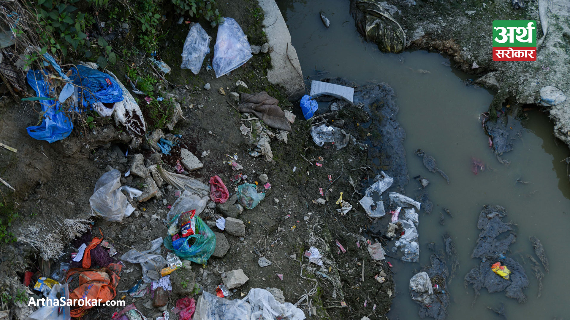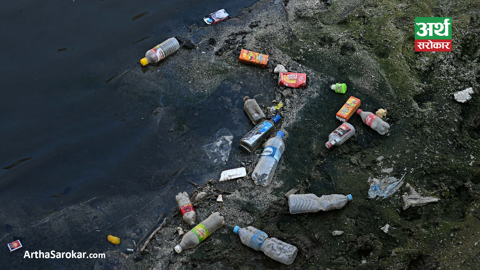 प्लास्टिक, घरेलु फोहोर, निर्माण सामग्री लगायतका थुप्राले नदीका सतह र किनार दुबै छोपिएका छन् ।