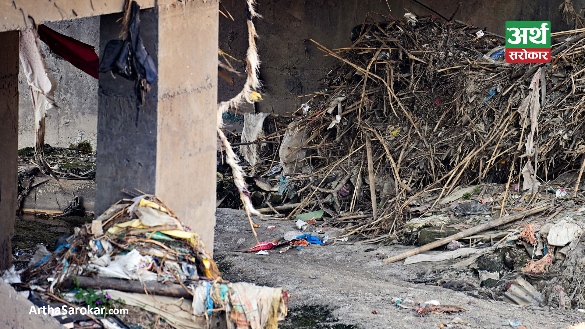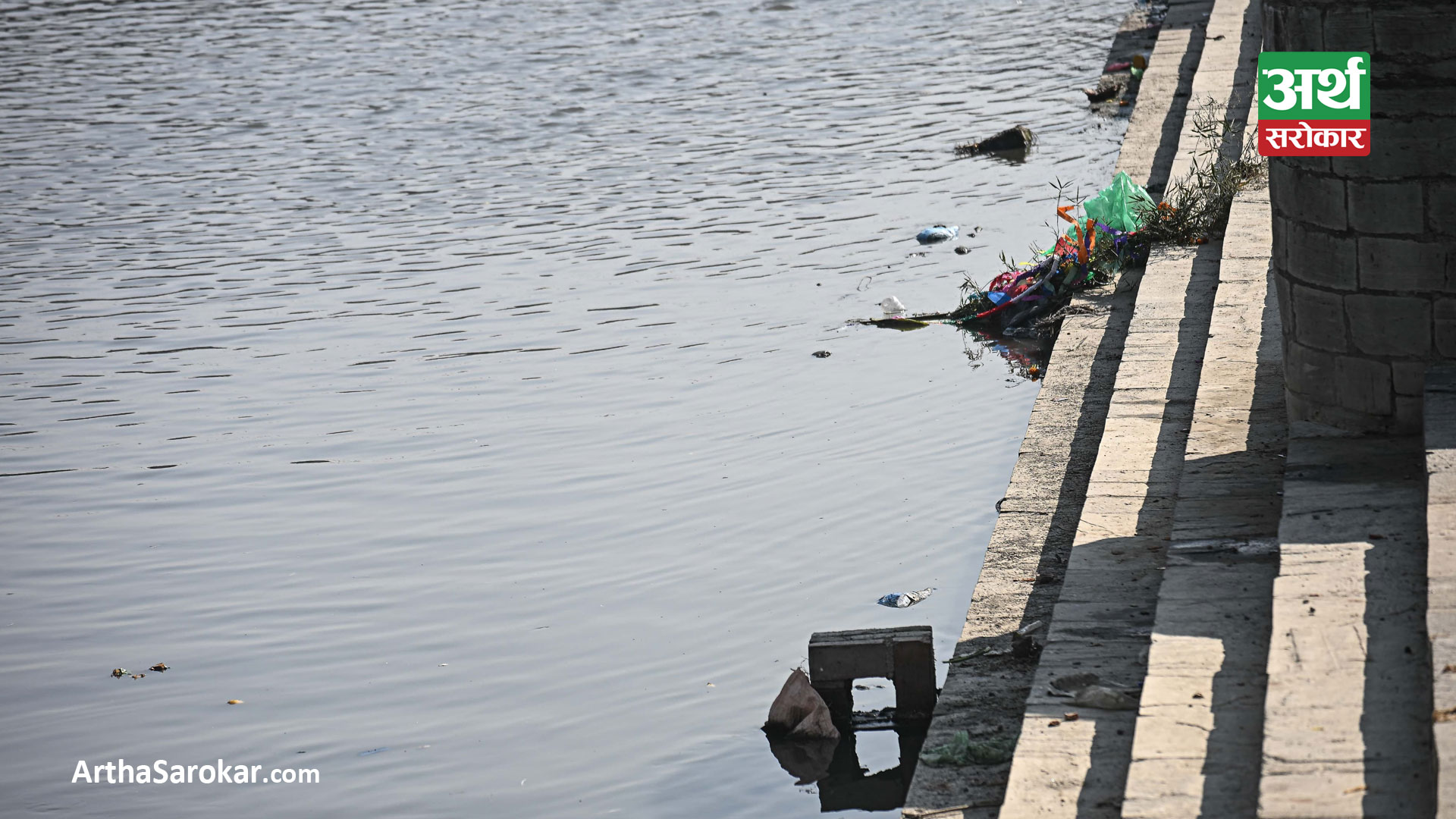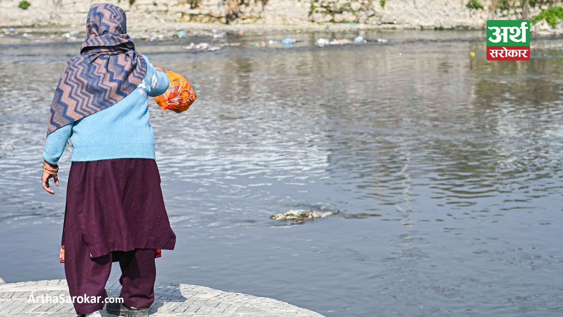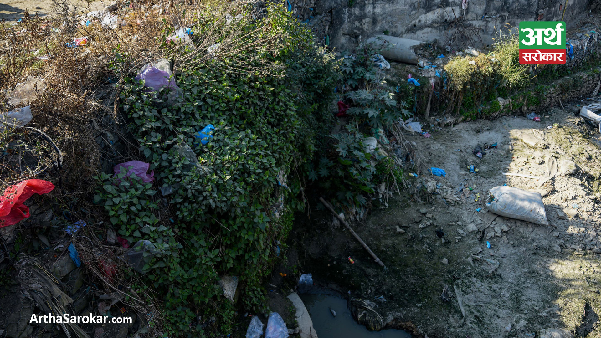 प्लास्टिक, घरेलु फोहोर, निर्माण सामग्री लगायतका थुप्राले नदीका सतह र किनार दुबै छोपिएका छन् ।