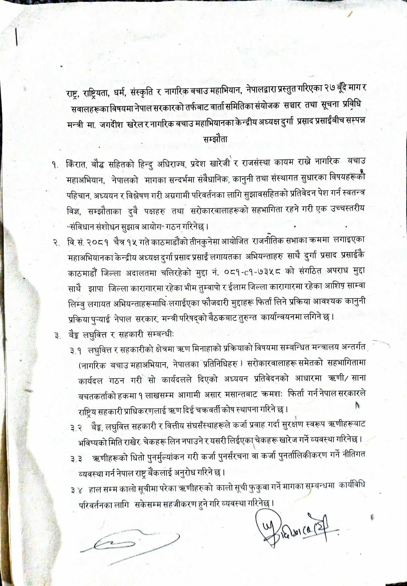 सरकार र दुर्गा प्रसाईं नेतृत्वको राष्ट्र, राष्ट्रियता, धर्म, संस्कृति र नागरिक बचाउ महाभियान, नेपालबीच सम्झौता पत्रमा हस्ताक्षर भएको छ । नेपाल सरकारका तर्फबाट वार्ता समितिका संयोजक सञ्चार तथा सूचना प्रविधिमन्त्री जगदीश खरेल र महाअभियानका तर्फबाट दुर्गा प्रसाईंले सम्झौतापत्रमा हस्ताक्षर गरेका हुन् ।