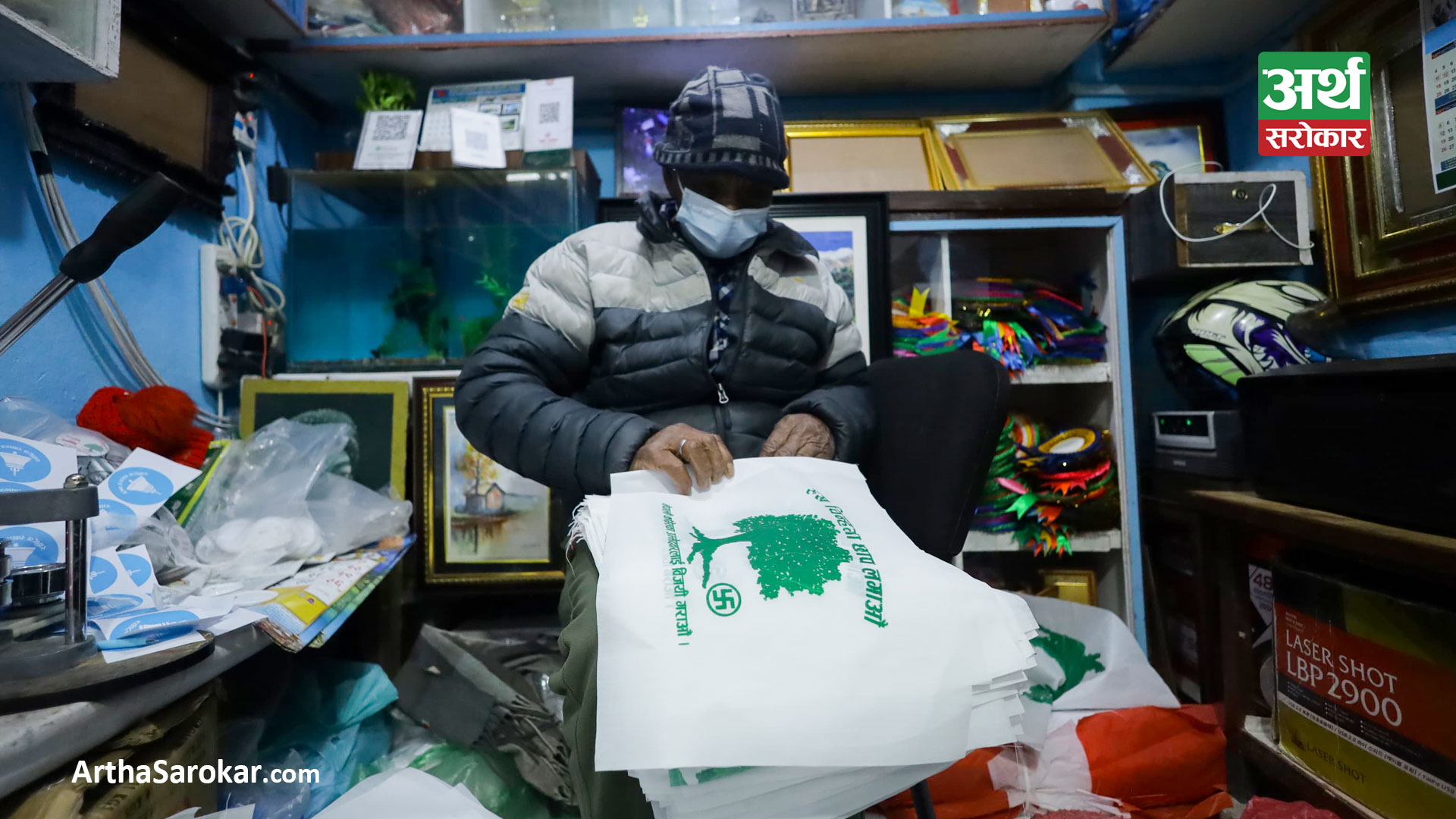 निर्वाचन प्रचारप्रसारमा दलका झण्डा र प्रचार सामग्री प्रयोगमा निर्वाचन आयोगले कडाइ गरेका कारण अर्डर कम आएको हुन सक्ने व्यवसायीहरुको अनुमान छ । बाँकी तस्विरमा हेर्नुहोस्ः