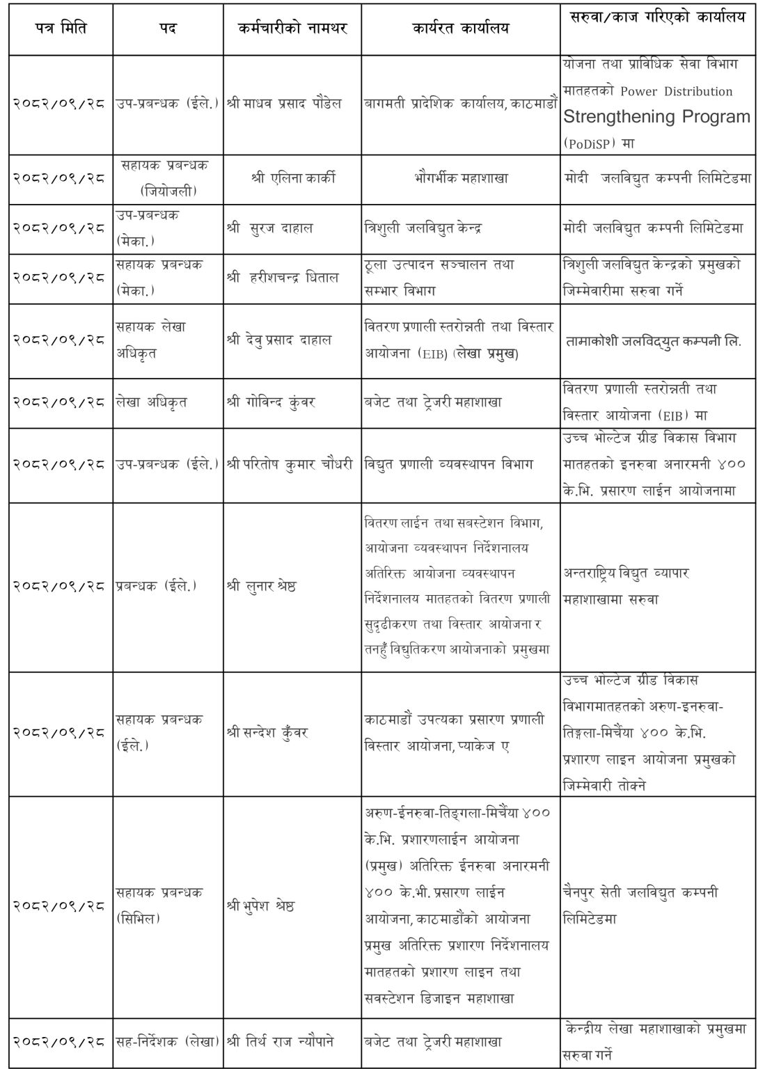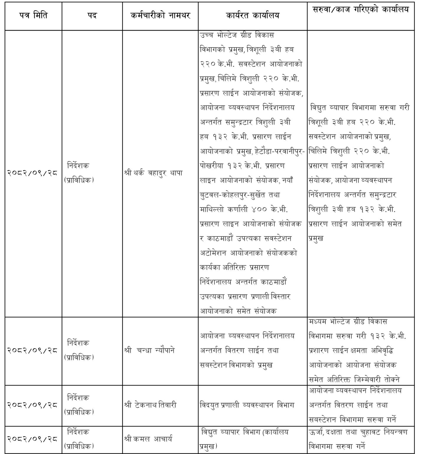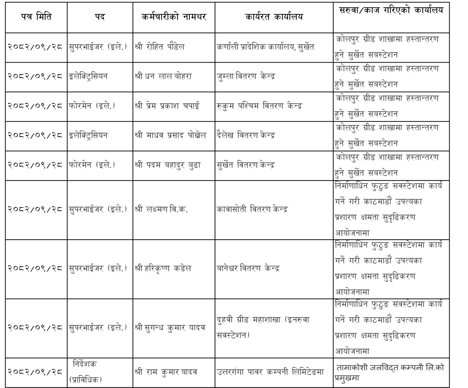 त्यस्तै, टेकनारायण तिवारीलाई भने आयोजना व्यवस्थापन निर्देशनालय अन्तर्गतको वितरण लाइन तथा सवस्टेसन विभागमा सरुवा गरिएको छ । यता तामाकोशी जलविद्युत् कम्पनीका प्रमुख विनोद भण्डारीलाई पनि उत्तरगंगा पावर कम्पनीमा सरुवा गरिएको छ ।