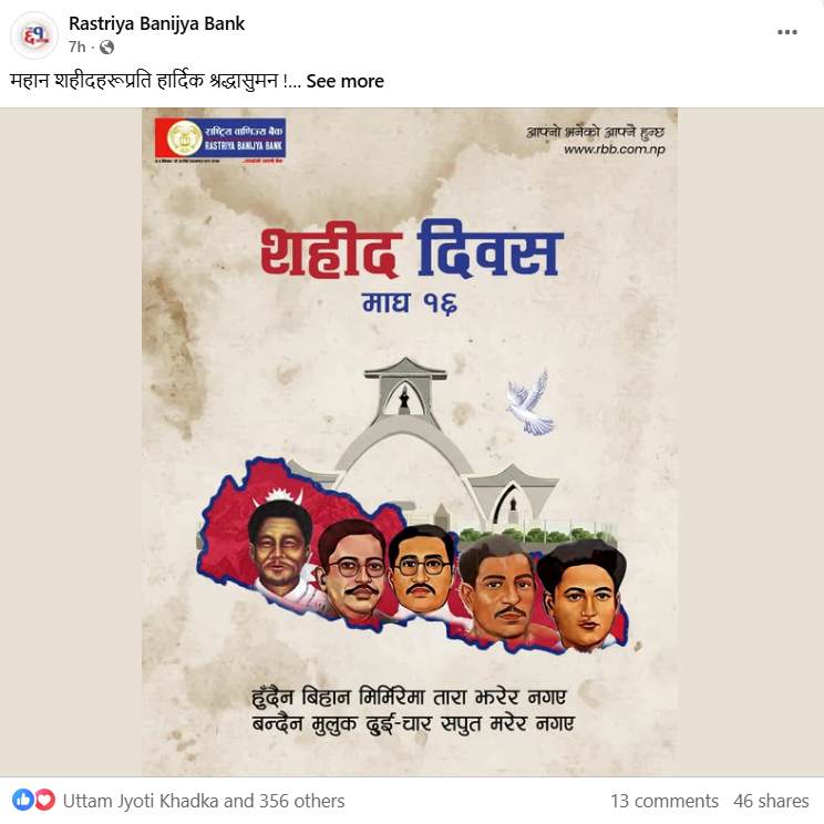 काठमाडौँ । राष्ट्रिय वाणिज्य बैंकले चुच्चोबिनाको नक्सा राखेर शहीद दिवसको अवसरमा शहीदहरुप्रति श्रद्दान्जली दिएको छ । बैंकले शहीद दिवसको अवसरमा सामाजिक सञ्जाल (फेसबुक) मा सेयर गरेको पोस्टमा नेपालको नक्सामा चुच्चो नै गायब पारिएको पाइएको हो ।