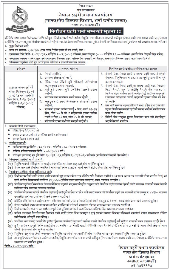 प्रहरी प्रधान कार्यालय, मानवस्रोत विकास विभाग, भर्ना छनोट शाखाले एक सूचना जारी गर्दै निर्वाचन लक्षित एक लाख ३३ हजार ९ सय ८० जना निर्वाचन प्रहरीका लागि दरखास्त आह्वान गरेको छ ।