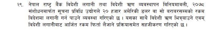 विदेशी लगानी तथा विदेशी ऋण व्यवस्थापनसम्बन्धी विनियमावली संशोधन गरी सूचना प्रविधि (आईटी) उद्योगलाई २० हजार अमेरिकी डलरसम्म विदेशमा लगानी गर्न पाउने व्यवस्था गरिएको राष्ट्र बैंकले जनाएको छ ।