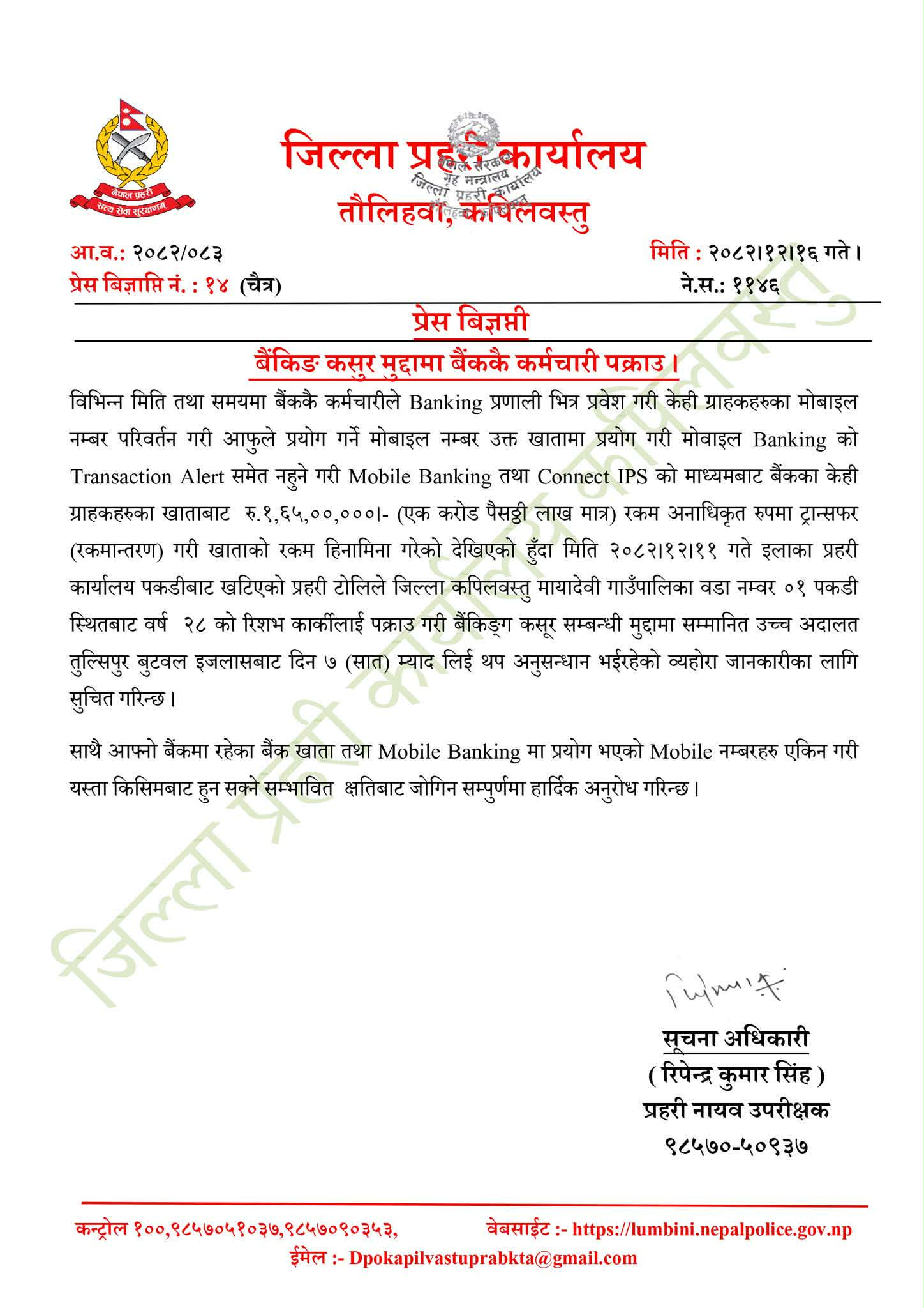 घटना कपिलवस्तुको हो । बिगत ८ बर्षदेखि बैंकको तौलिहवा शाखामा कार्यरत २८ बर्षीय रिसभ कार्की बैंकको सिष्टम चलाउँथे । उनलाई बैंकका अन्य कर्मचारीले सिष्टमको पासवर्ड दिएका थिए । त्यसपछि उनी ग्राहकको खातामा रहेको ग्राहकको फोन नम्बर परिवर्तन गरेर आफ्नो फोन नम्बर राखिदिन्थे । त्यसपछि भकाभक ग्राहकको रकम आफ्नो खातामा ट्रान्सफर गर्थे । एक दुई पटक यस्तो गर्दा पनि कसैले थाहा नपाएपछि उनले ग्राहकको रकम चोरेको चोर्यै गरे । ग्राहकको रकम चोर्दा चोर्दै उनले विभिन्न खातावालाको १ करोड ६५ लाख रुपैयाँ चोरेर करोडपति भए । तर ग्राहकले आफ्नो खाताबाट पैसा हराएको थाहा पाएपछि खोजिनिधि गर्दै जाँदा रकम बैंकका पियनले चोरेको पत्ता लाग्यो ।