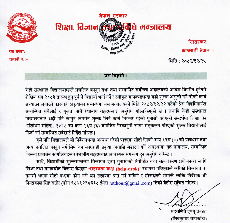 त्यस्तै, विद्यार्थीको शुल्कसम्बन्धी सिकायत एवम् गुनासोको रिपोर्टिङ तथा सहजीकरण प्रयोजनका लागि शिक्षा तथा मानवस्रोत विकास केन्द्रमा सहायता कक्ष (हेल्प डेस्क) स्थापना गरिएको मन्त्रालयले जनाएको छ ।