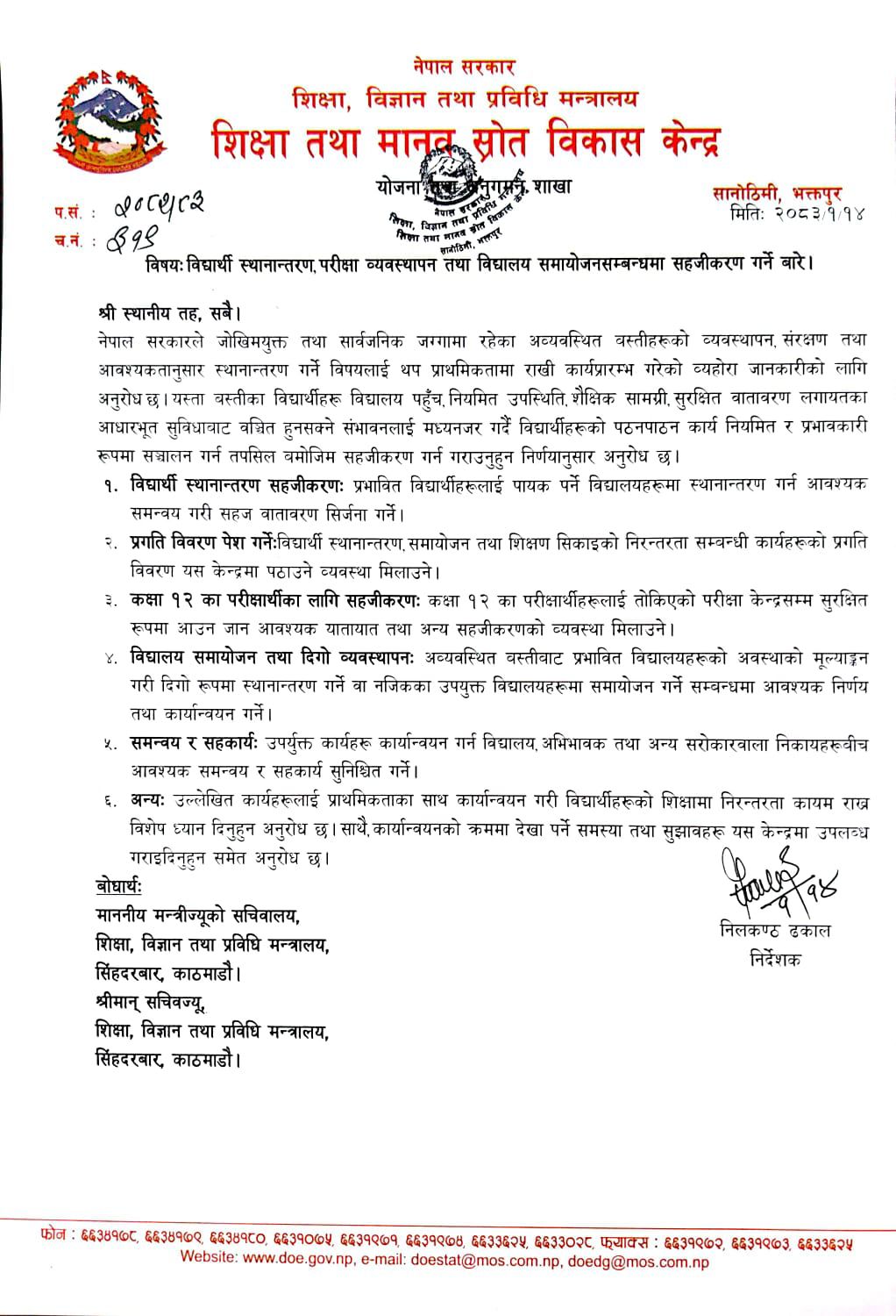 खासगरी सोमबारदेखि सुरु भएको कक्षा १२ को परीक्षामा सहभागी हुने परीक्षार्थीहरूलाई परीक्षा केन्द्रसम्म जान आवश्यक सहजीकरण गर्न र विद्यालय नै प्रभावित भएको ठाउँमा वैकल्पिक व्यवस्था गर्न गराउन अनुरोध गरेको छ ।