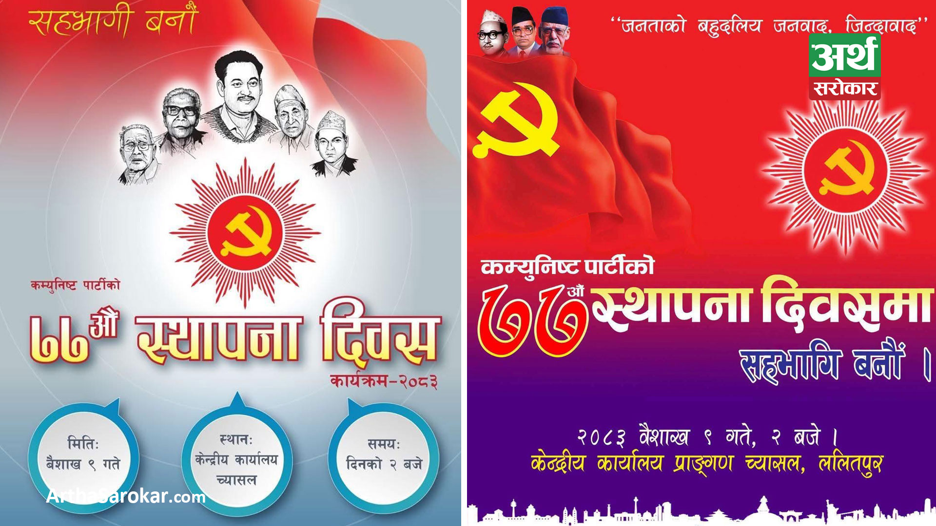एमालेले बैशाख ९ गते (बुधबार) पार्टीको केन्द्रीय कार्यालय, च्यासलमा कम्युनिष्ट पार्टीको ७७औँ स्थापना दिवस मनाउँदै छ ।