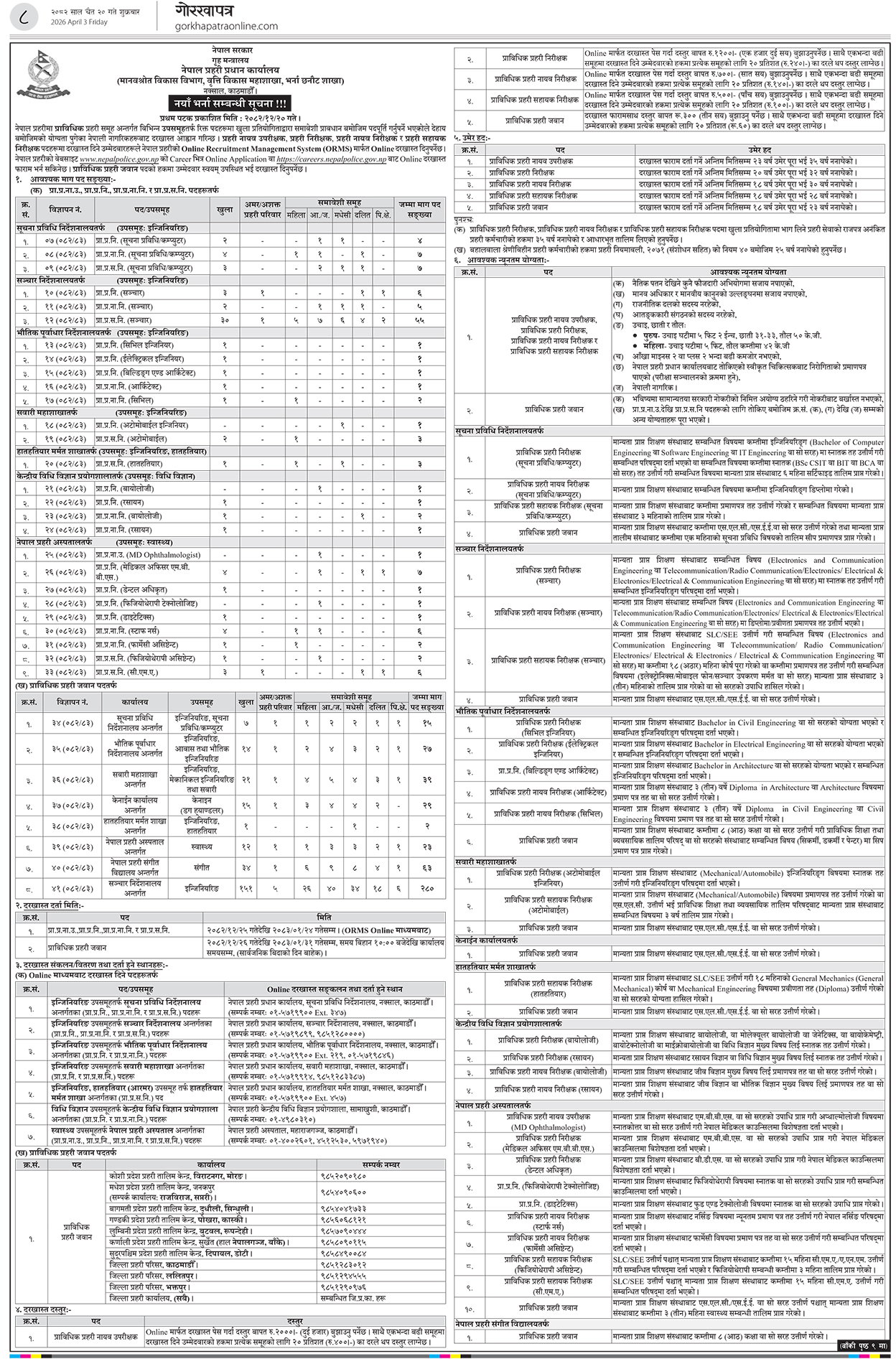 भर्ना खुलाइएको सूचना सार्वजनिक गर्दै नेपाल प्रहरीले इन्जिनियरिङतर्फ कम्प्युटर, सञ्चार, सिभिल, इलेक्ट्रिकल, बिल्डिङ एण्ड आर्किटेक, अटोमोबाइल क्षेत्रमा भर्ना खुलाइएको जनाएको छ ।