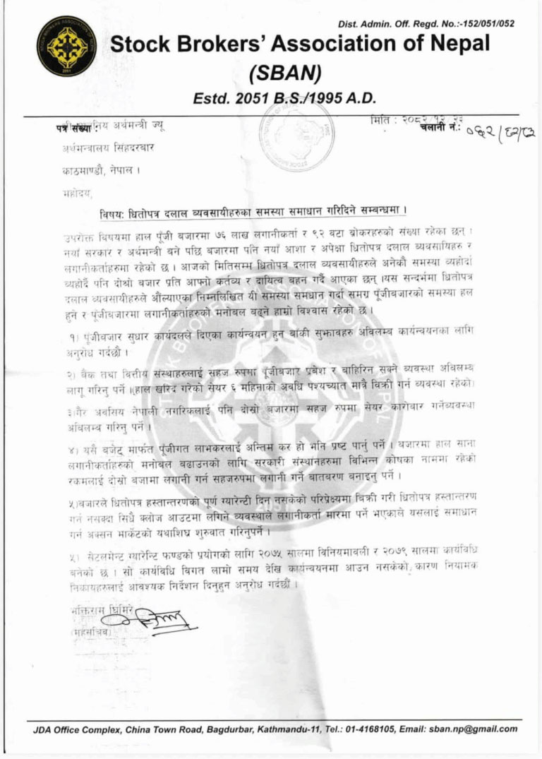 नयाँ सरकार गठन भए लगत्तै सेयर बजारमा देखिएको उतारचढावका कारण सेयर लगानीकर्ताको मनोबल खस्किएको छ । सोहि कारण लगानीकर्ताको मनोबल बढाउनको लागि सरकारी संस्थानहरुमा विभिन्न कोषका नाममा रहेको रकमलाई दोस्रो बजारमा लगानी गर्न सहज रुपमा लगानी गर्ने वातावरण बनाइदिन एशाेसिएसनले माग गरेको छ ।