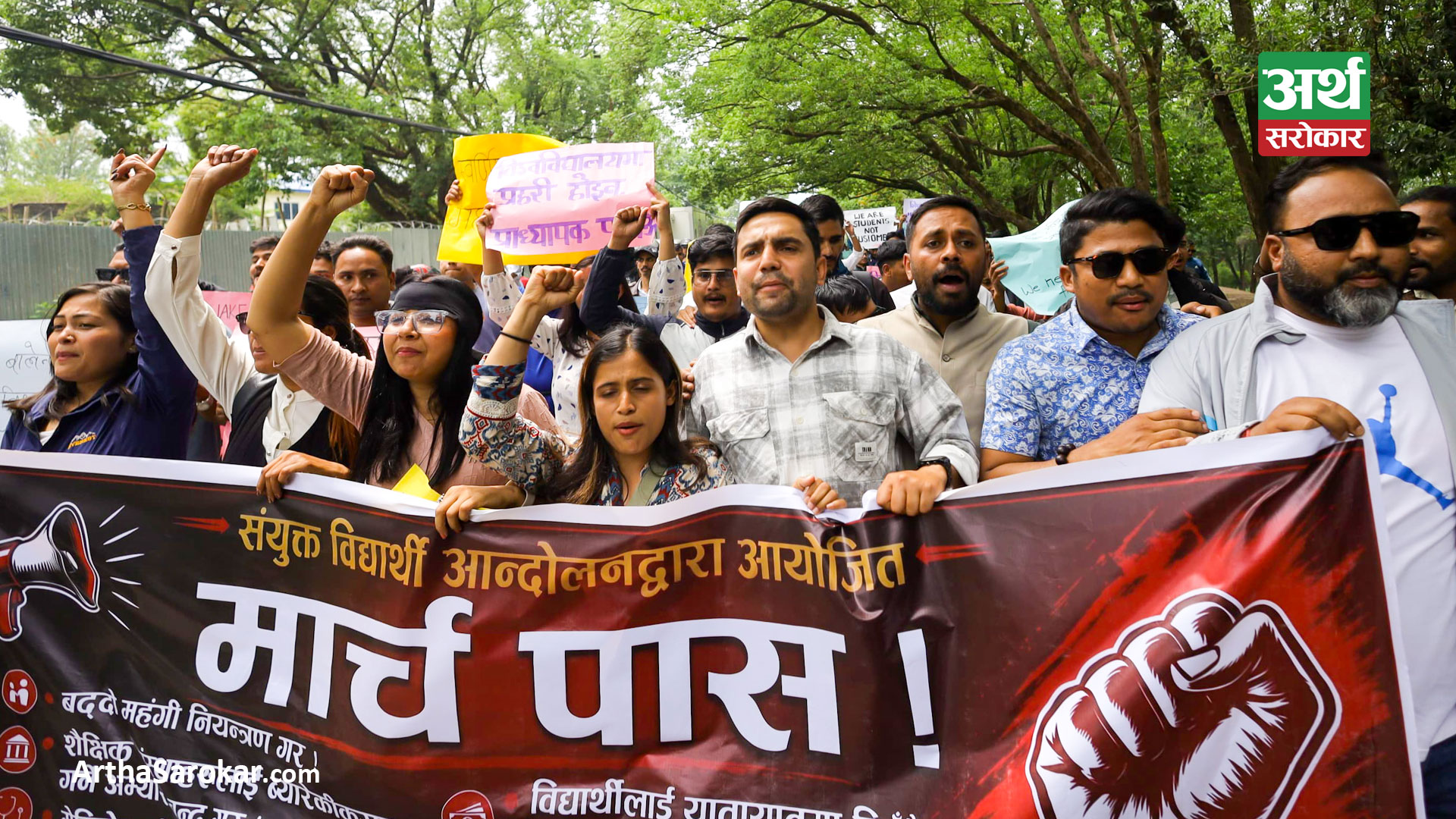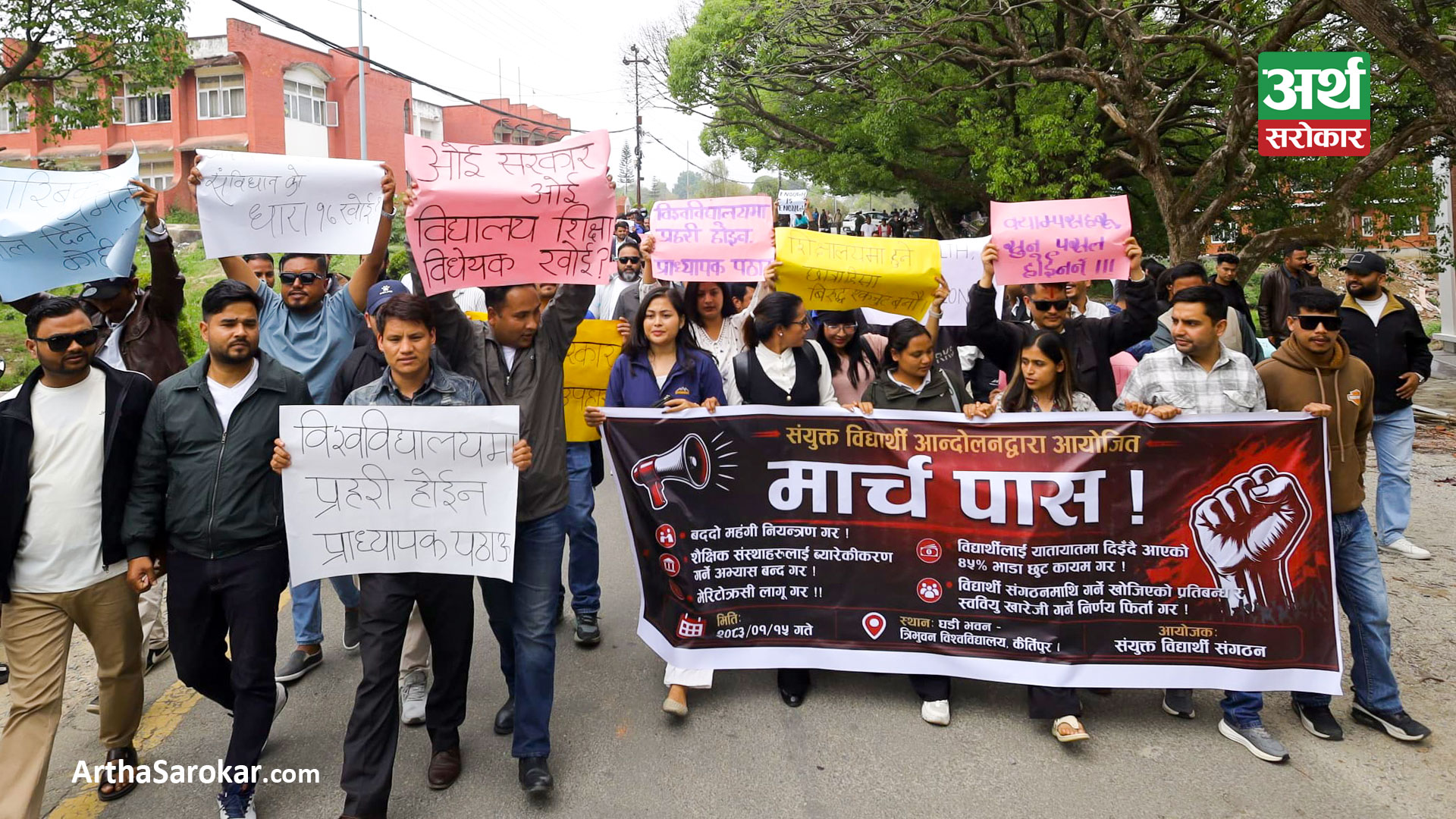 काठमाडौँ । संयुक्त विद्यार्थी आन्दोलनले विभिन्न राजनीतिक दलसँग सम्बद्ध विद्यार्थी संगठनहरूमाथि प्रतिबन्ध लगाउने सरकारको तयारीको विरोधमा त्रिभुवन विश्वविद्यालय परिसरमा मार्चपास गरेको छ ।